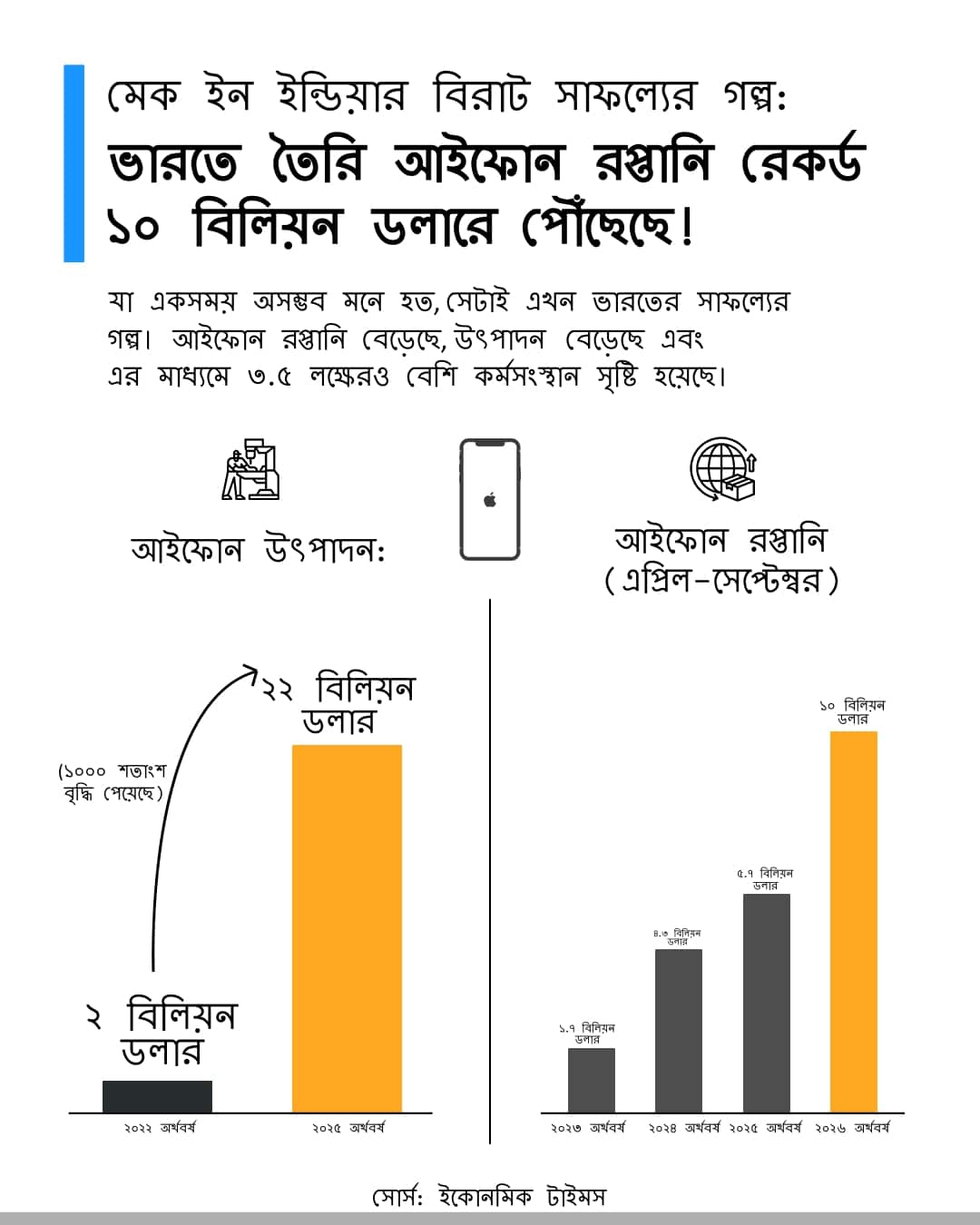 মেক ইন ইন্ডিয়ার বিরাট সাফল্যের গল্প: ভারতে তৈরি আইফোন রপ্তানি রেকর্ড ১০ বিলিয়ন ডলারে পৌঁছেছে!