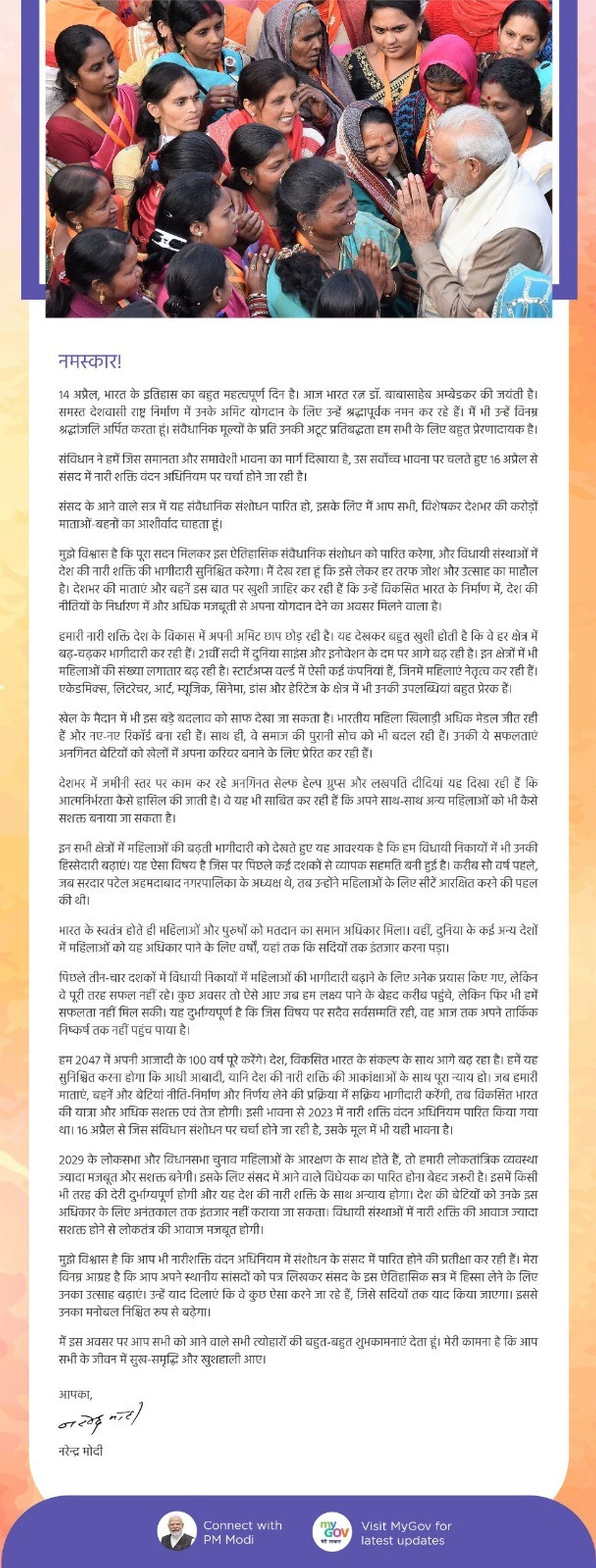 भारत की नारी शक्ति को समर्पित अपने इस पत्र में मैंने दशकों से लंबित इस संकल्प को जल्द साकार करने के विषय में देशवासियों के साथ अपनी भावनाएं साझा की हैं…”