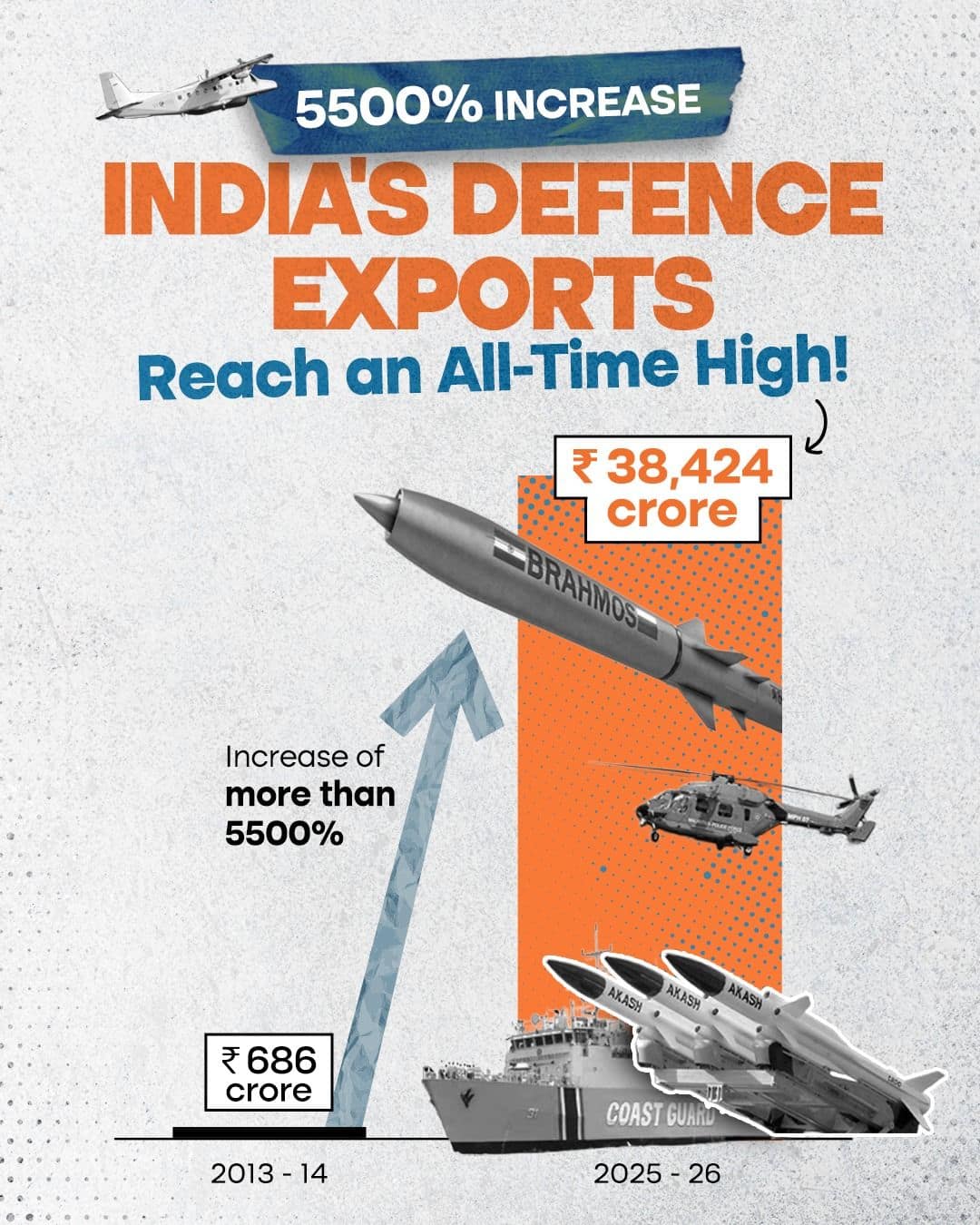 2025-26 സാമ്പത്തിക വർഷത്തിൽ പ്രതിരോധ കയറ്റുമതി 38,424 കോടി രൂപയായി ഉയരും, മുൻ സാമ്പത്തിക വർഷത്തേക്കാൾ 62.7 ശതമാനം വർധന.