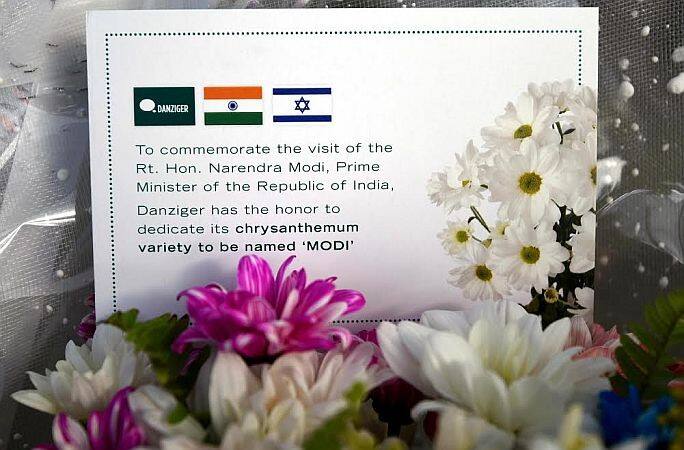 The two leaders were briefed about the research technologies being used there for floriculture. Cutting-edge agricultural technologies of Volcani center (the research arm of Ministry of Agriculture) were also displayed and explained. These include remote sensing, GIS, and post-harvest technologies. The first bunch of a Chrysanthemum flower named after Prime Minister Narendra Modi, was presented to the PM. The flower has been named "MODI."