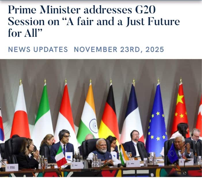 * Prime Minister addressed today the third session of the G20 Summit on "A Fair and a Just Future for All - Critical Minerals; Decent Work; Artificial Intelligence.” Prime Minister called for a fundamental change in the way critical technologies are promoted. He noted that such technology applications must be ‘human-centric' rather than 'finance-centric', 'global' rather than 'national', and based on 'open source' rather than 'exclusive models'.