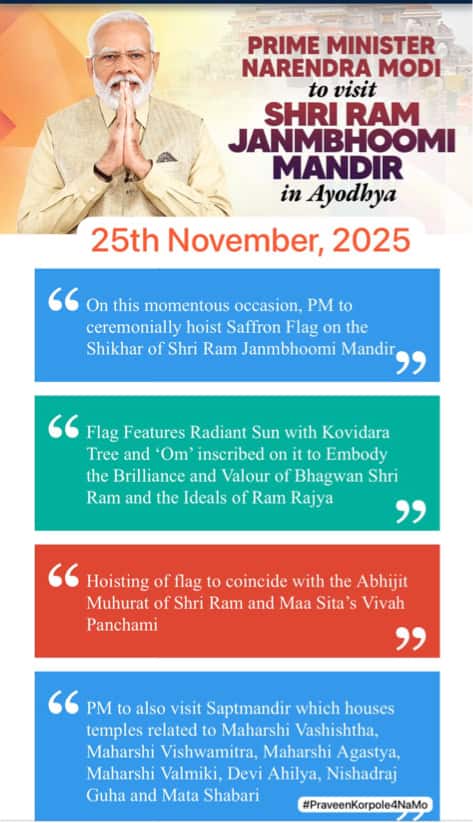 * At around 12 noon, Prime Minister will ceremonially hoist a saffron flag on the Shikhar of the sacred Shri Ram Janmbhoomi Temple in Ayodhya, symbolizing the completion of the temple’s construction and ushering in a new chapter of cultural celebration and national unity. Prime Minister will also address the gathering on this historic occasion.