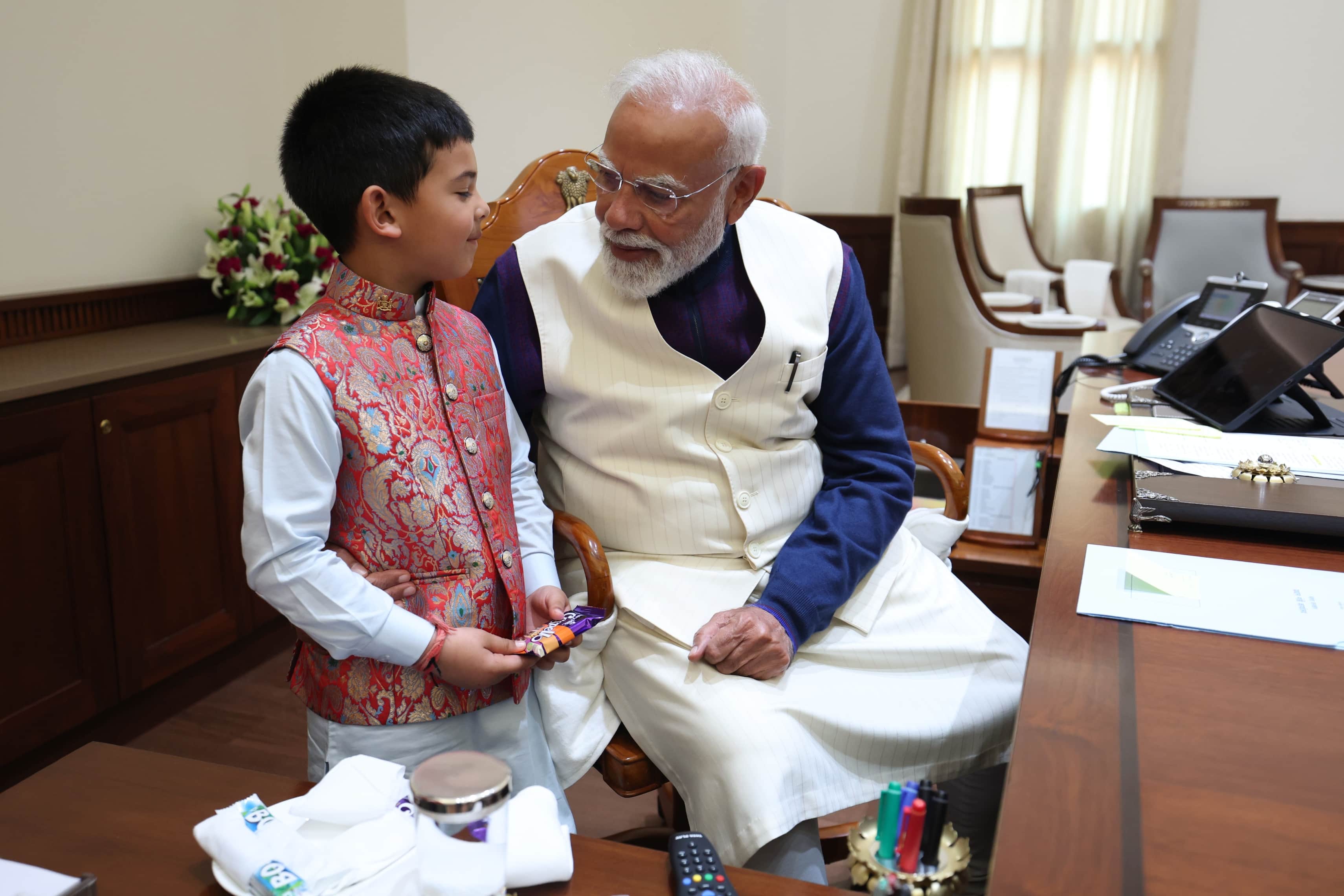 A warm moment as PM Modi offers chocolates to his young friend.