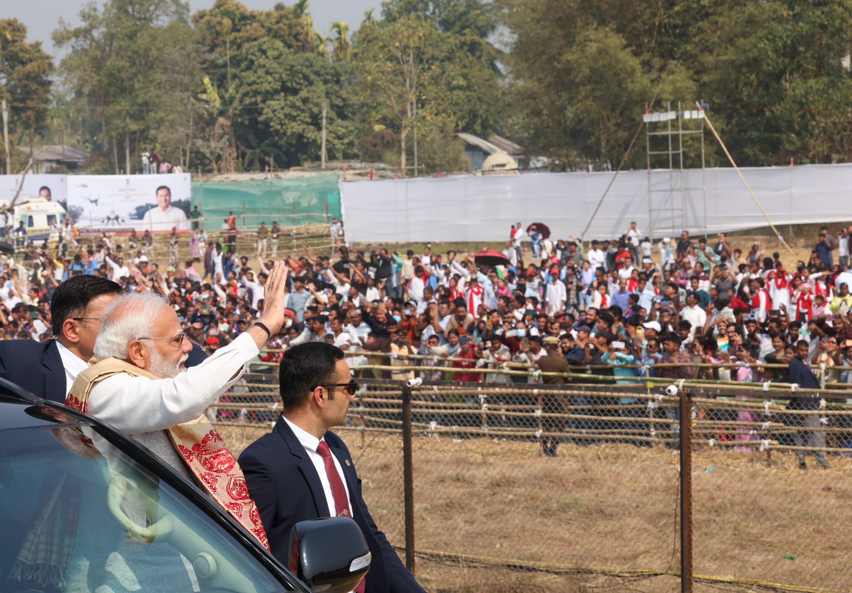 PM Modi waves to an enthusiastic crowd in Dibrugarh, Assam.