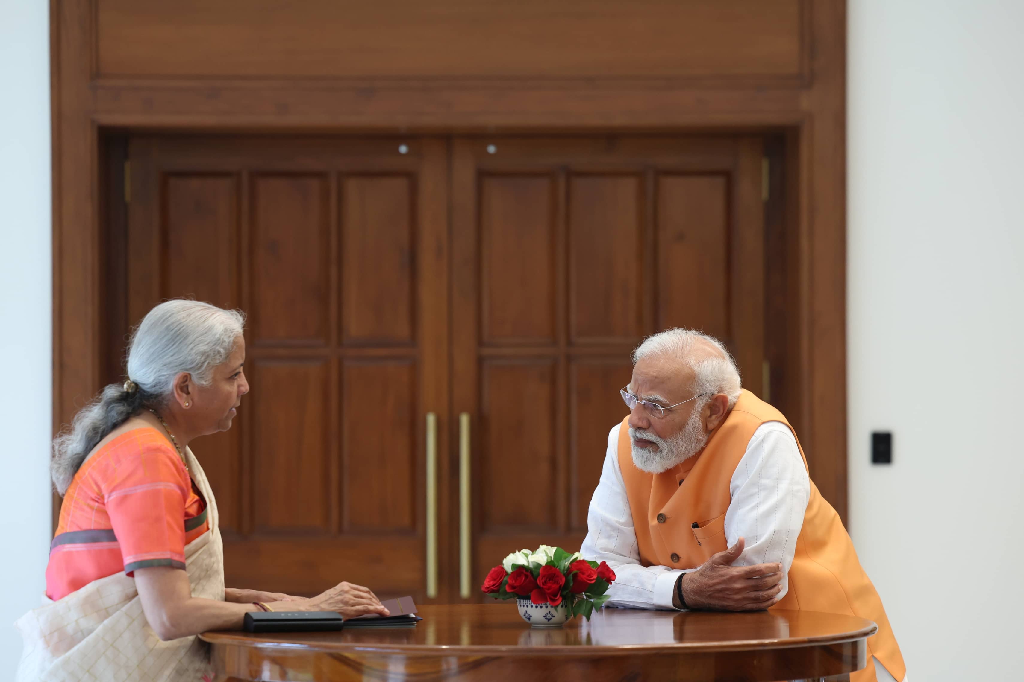 PM Narendra Modi interacts with Finance Minister Smt. Nirmala Sitharaman at Seva Teerth.