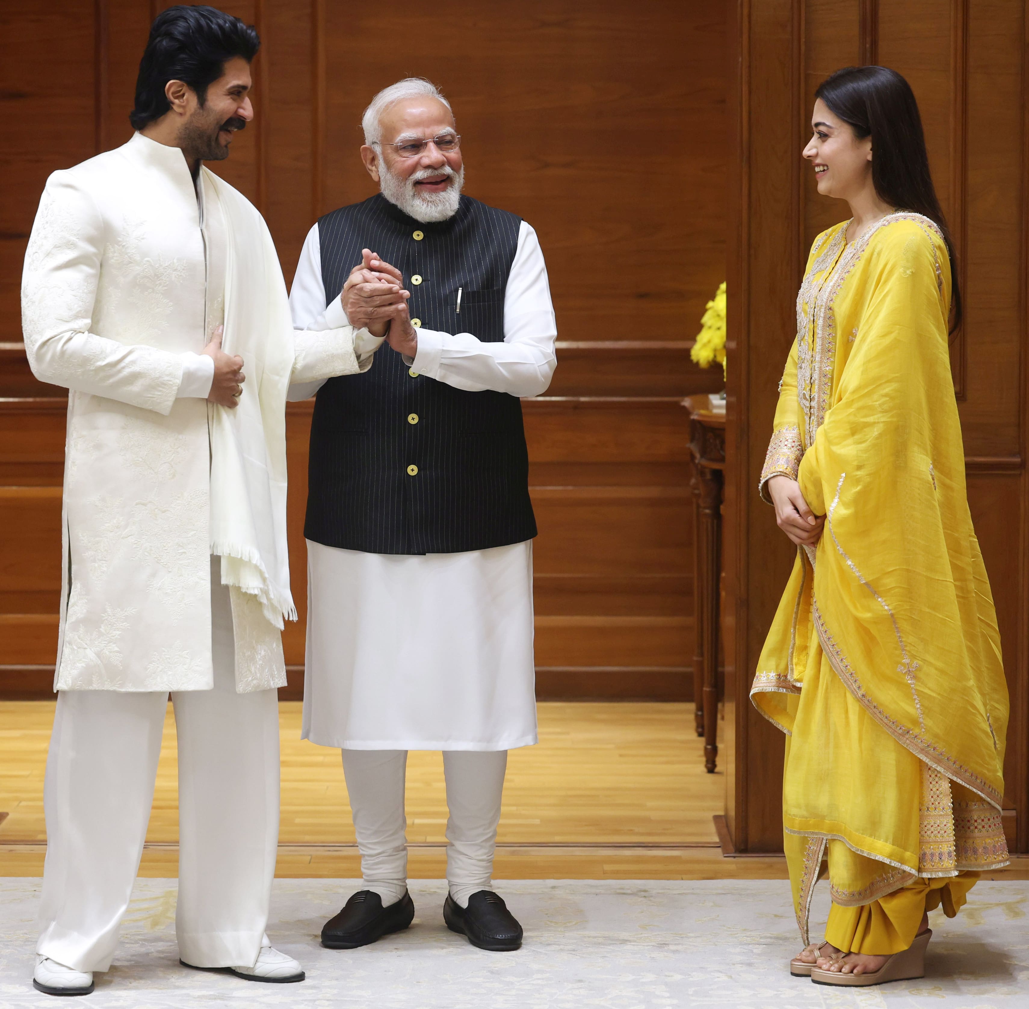 PM Modi meets actors Rashmika Mandanna and Vijay Deverakonda at 7, Lok Kalyan Marg.