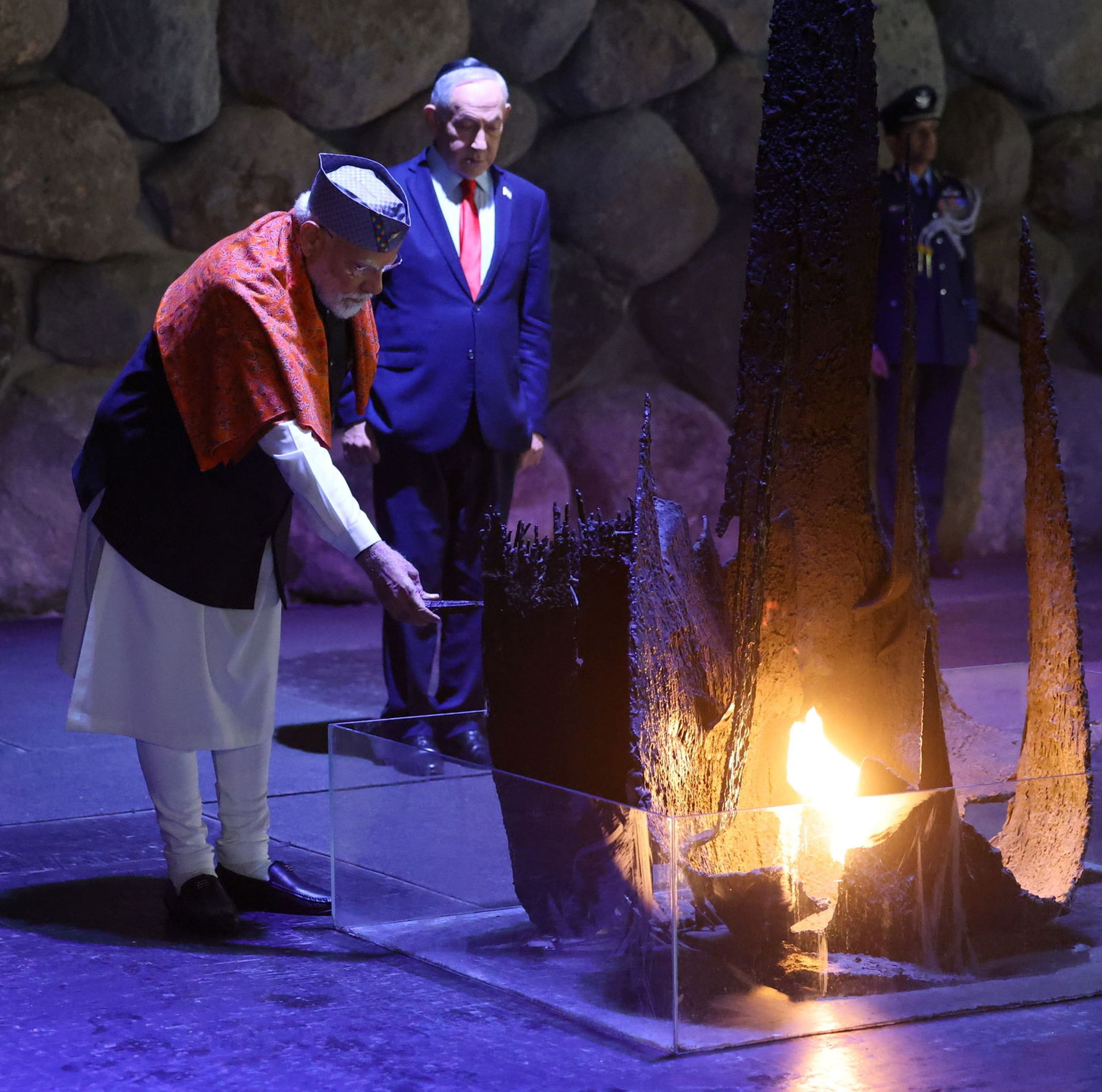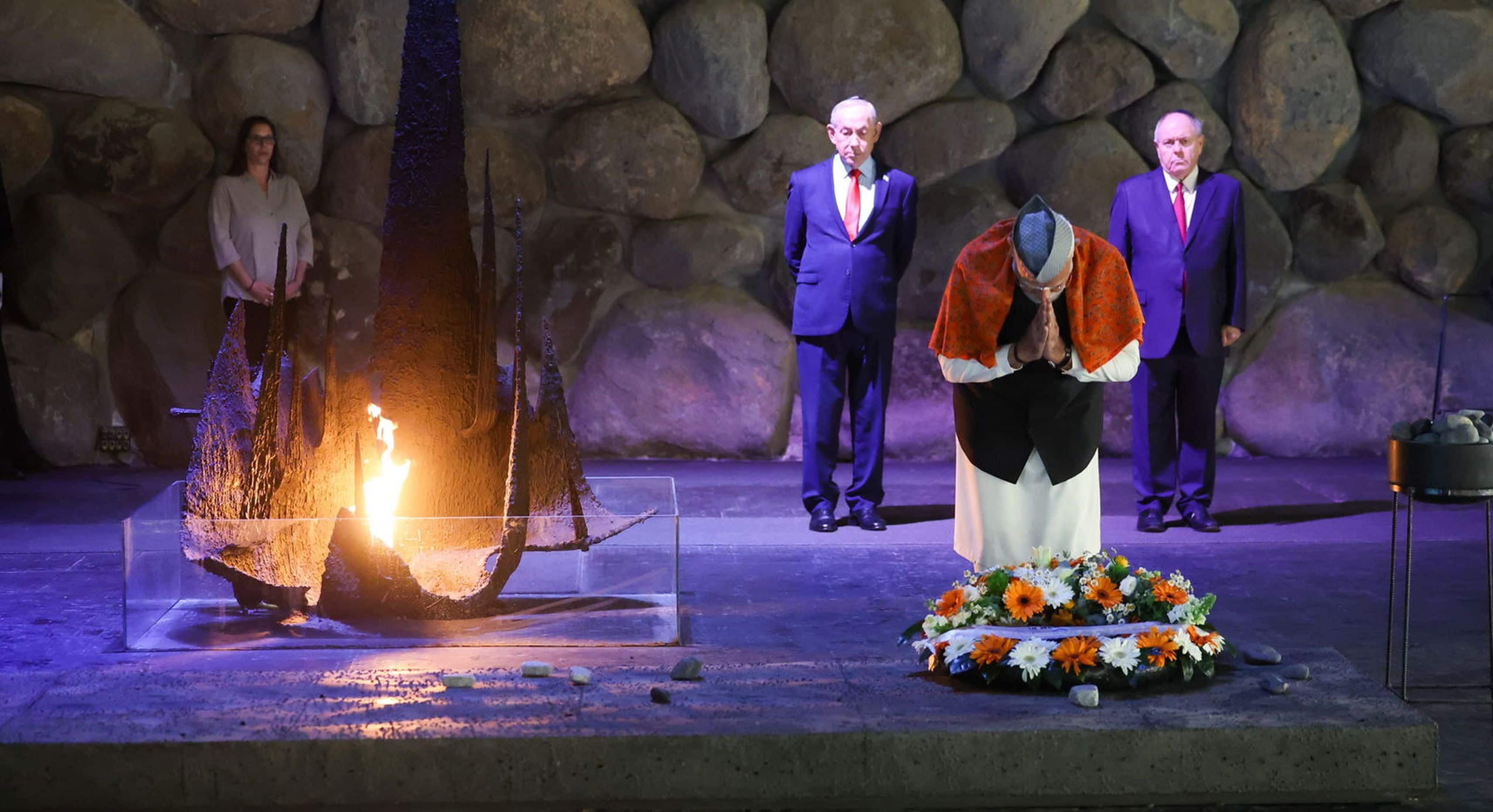 Prime Minister Shri Narendra Modi, accompanied by the Prime Minister of Israel, H.E Mr. Benjamín Netanyahu, visited Yad Vashem – The World Holocaust Remembrance Centre - in Jerusalem today, and paid tribute to the victims of the Holocaust. Prime Minister participated in a solemn ceremony at the Hall of Remembrance. The ceremony was marked by the poignant recital of the "El Maleh Rahamim" by the Cantor. Prime Minister also visited the Book of Names Hall which displays personal stories of the victims of the Holocaust.