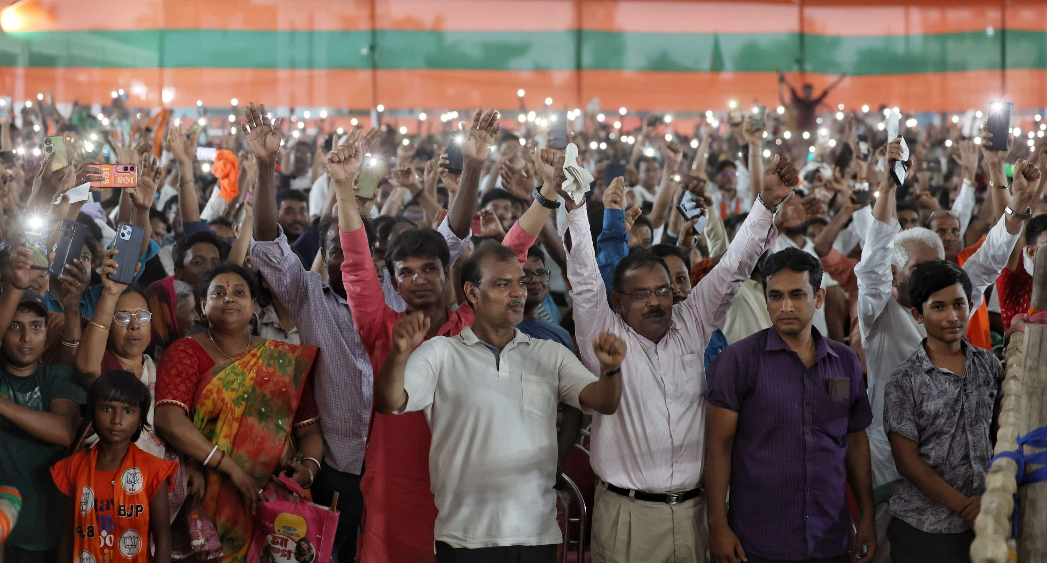 आज क्रांतिकारियों की इस तपोभूमि में...आप सभी जनता-जनार्दन के दर्शन का सौभाग्य मिला है। एक बार अपना मोबाइल फोन निकालिए और फ्लैश लाइट चालू कीजिए.... सब के सब मोबाइल बाहर हो जाए... सब अपने मोबाइल की फ्लैश लाइट चालू कीजिए... वाह.. देखिए दूर-दूर तक... ये विजय पक्का दिख रहा है... देखिए चारों तरफ विजय का विश्वास और टीएमसी के अंधकार का खात्मा ये सब साफ-साफ दिख रहा है। बोलिए.. मेरे साथ भारत माता की... भारत मता की... भारत माता की...